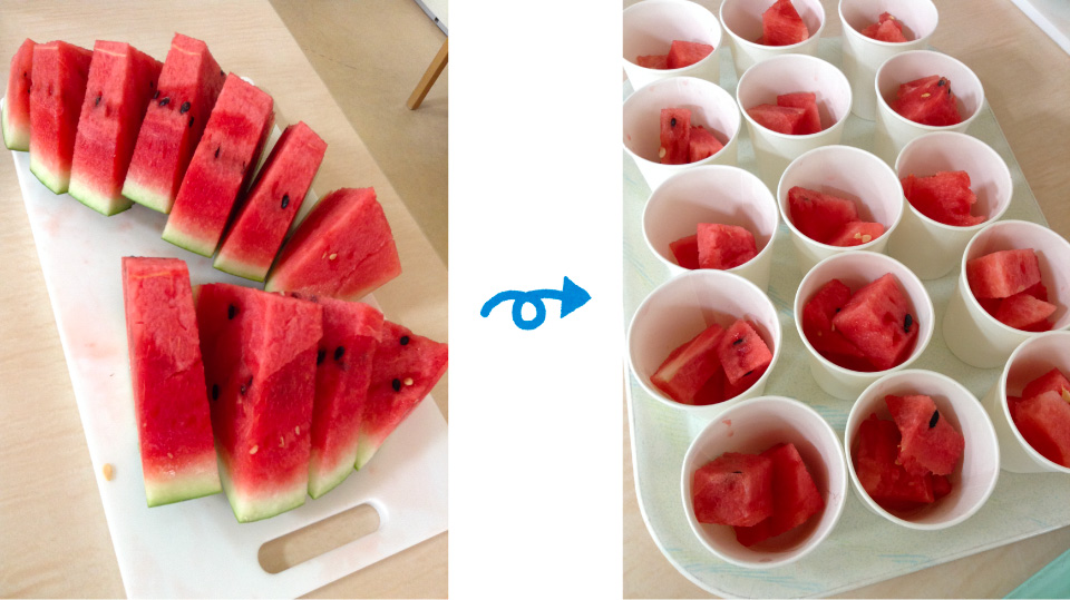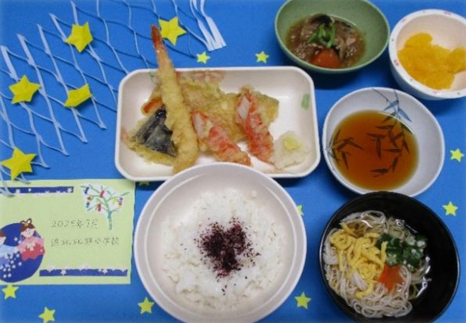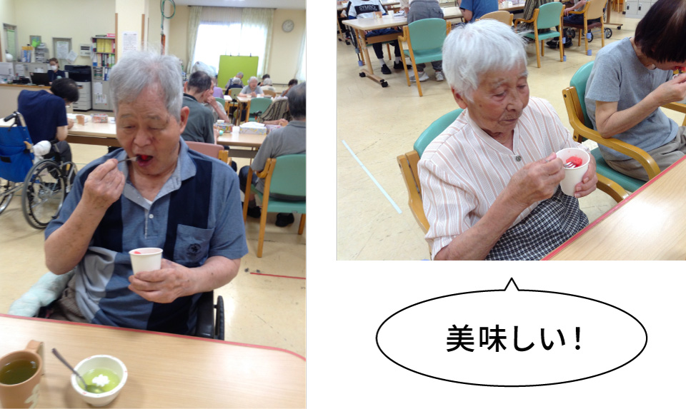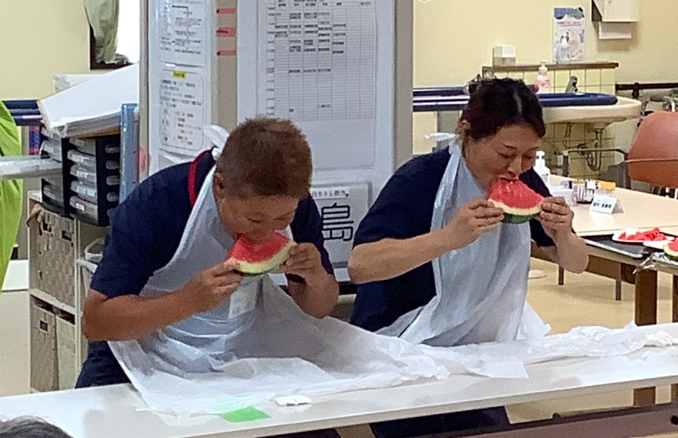 介護施設にて試食会を行いました! 今月はわかば農園で採れたジャガイモとスイカの試食会を行いました🍉どちらも良い出来で、ジャガイモは手のひらより大きいサイズのものもありました😲!スイカは甘みもしっかりあり、皆さんにも大変好評でした😋 ジャガイモは茹でて皮をむいてじゃがバターに、スイカは一口サイズにカットしてお出ししました。 職員も一緒にいただきましたが、どちらも美味でした🥰 職員同士でスイカの早食い競争も行いました😆一切れでも早く食べるのはなかなか難しい! ※顔写真掲載にあたりご許可をいただいています。 [七夕献立☆彡] ゆかりご飯 冬瓜の煮物 天ぷら盛り合わせ 天つゆ 七夕そうめん椀 なつみかん缶 そうめん椀はオクラや星形の人参で七夕をイメージして盛り付けました。 天ぷらの盛り合わせは4種盛りでボリュームもあり、カラッと揚がっていて美味しいと好評でした。食事に添えた行事カードは浜北北部中学校の生徒さんが手作りしてくれました。一枚一枚違う手作りカードに皆様とても喜んでいました✨栄養科